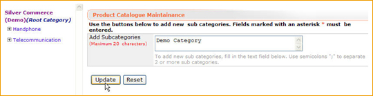 Specify the name of the new product category and identify the parent category if you wish to tie the new category to an existing category. If the new category stands alone, leave the parent category field blank. Click on the 'Update' link when you are done.