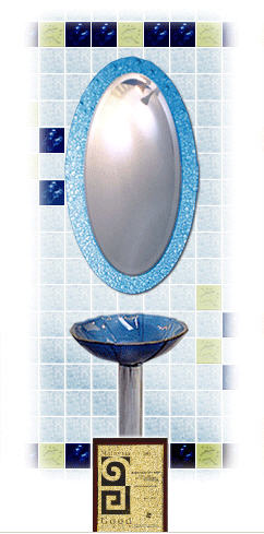 This is a modern yet simple set of bathroom set for small to medium-sized bathroom that consist of an oblong blue glass basin with oval-shaped decorative mirror. It won an award for good design from local design council.