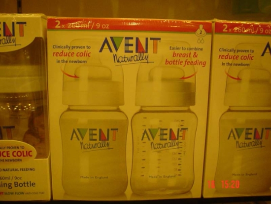 The AVENT Feeding Bottle uses the unique AVENT Teat with its patented anti-vacuum skirt which prevents the swallowing of air and reduces the risk of colic. Shaped for stability and comfort, its waisted shape is easier to hold and its wide-neck design makes filling and cleaning easy. Clear markings on the bottle ensure accurate measurement and make it easier to determine how much baby has been fed. The dome cap seals the teat securely, to ensure leak proof mixing and travel without the need for separate sealing discs. Available 3 sizes - 125ml/4oz; 260ml/9oz; 'Magnum' 330ml; all sizes available in twin and triple packs.