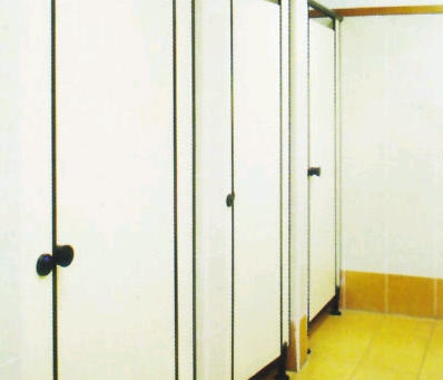 This High Pressure Laminate (HPL) compound is made of several layers of Kraft and decorative paper with melamine finish on both sides. | Thickness | 10mm, 13mm and 18mm | | Locksets | Stainless steel latch with indicator disc in red/green | | Hinges | Stainless steel springloaded hinges for self-closing purpose | | Coat Hook | Stainless finish with cover | | Pilaster Footing | Optional for floor-anchored system |
